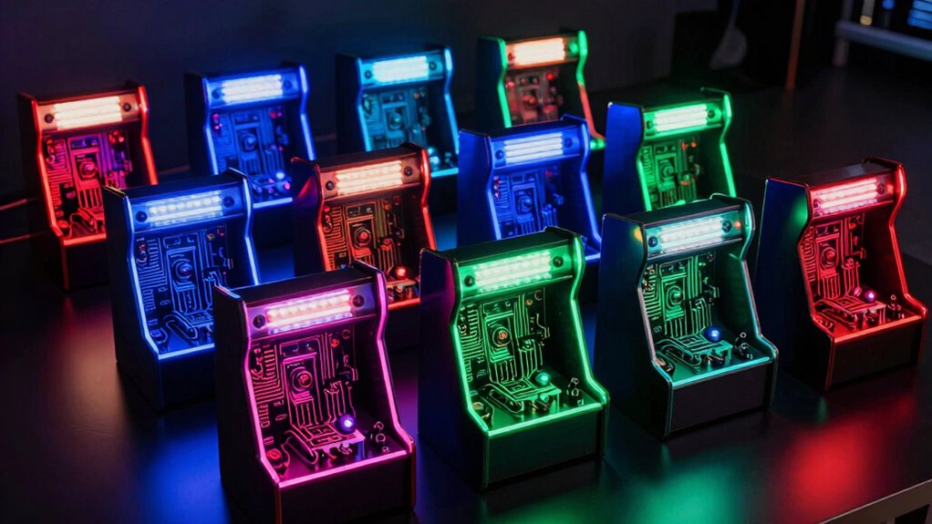 When choosing a LED arcade marquee kit, one of the most important factors to contemplate is the power source, as it directly influences the setup’s convenience and safety. These kits can be powered by USB cables, batteries, or AC adapters, each offering different benefits. USB power is popular because it’s simple, low-voltage, and compatible with computers, power banks, or wall adapters, making setup straightforward. Battery-powered options provide cordless flexibility, ideal for areas without nearby outlets, usually using AA or rechargeable batteries. Some kits even offer multiple power options, allowing you to switch between USB and batteries depending on your needs. The choice impacts energy efficiency, safety, and long-term usability, so consider your installation environment and portability preferences carefully.
